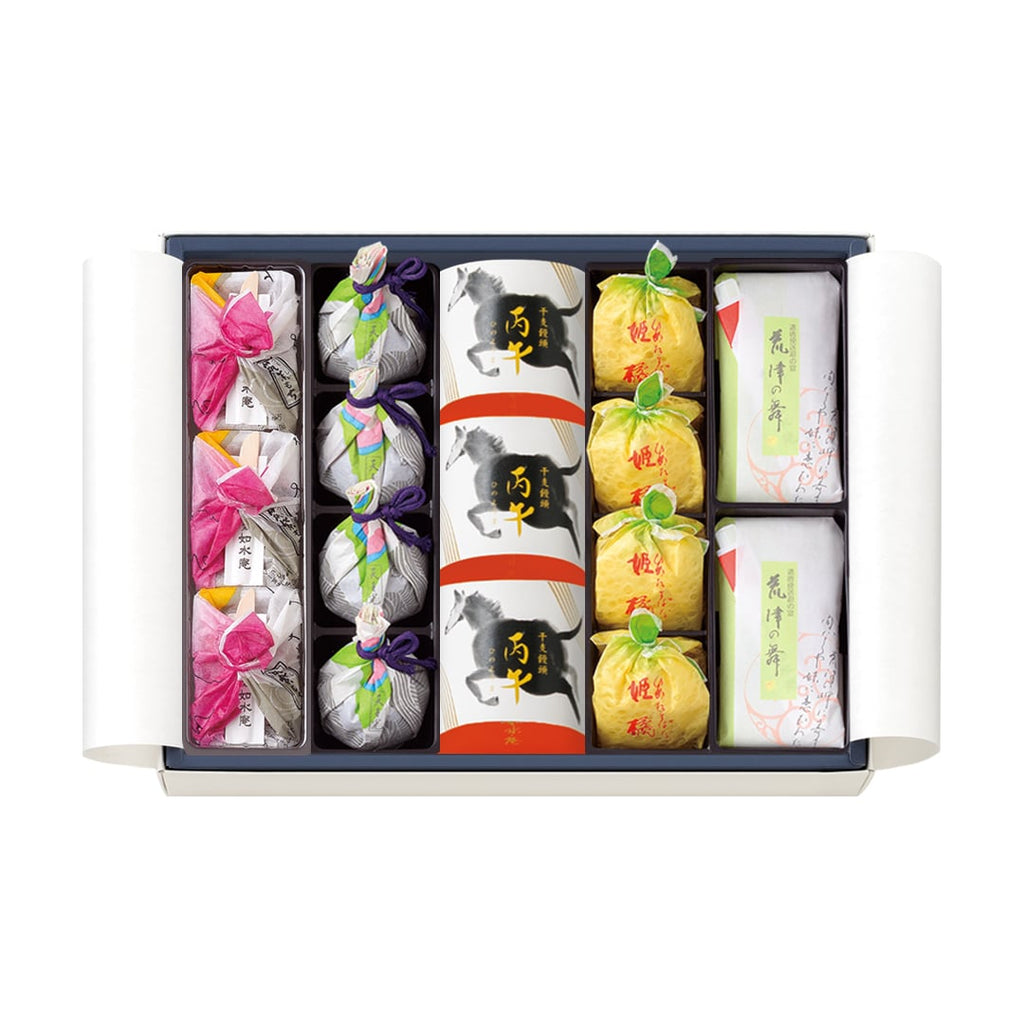 九州産の「ヒヨク米」をこだわりの水で煉り上げた餅に、希少な大豆(タマホマレ)の黄な粉をまぶした「筑紫もち」3個、まるごと一個の栗を十勝平野で採れたアカネ大納言で包んだ「天王光」4個、香り高い栗と焦がしバターを合わせた特製栗餡と上品な白あんの二層の餡を国産小麦と和三盆を使った生地で包んだ「干支まんじゅう 丙午」3個、やわらかい黄身時雨と紅餡の中に、種抜きの蜜漬金柑をまるごと包んだ「姫橘」4個、やわらかなお餅で自家製の香り豊かな柚子餡を包んだ「荒津の舞」4個を詰合せました。