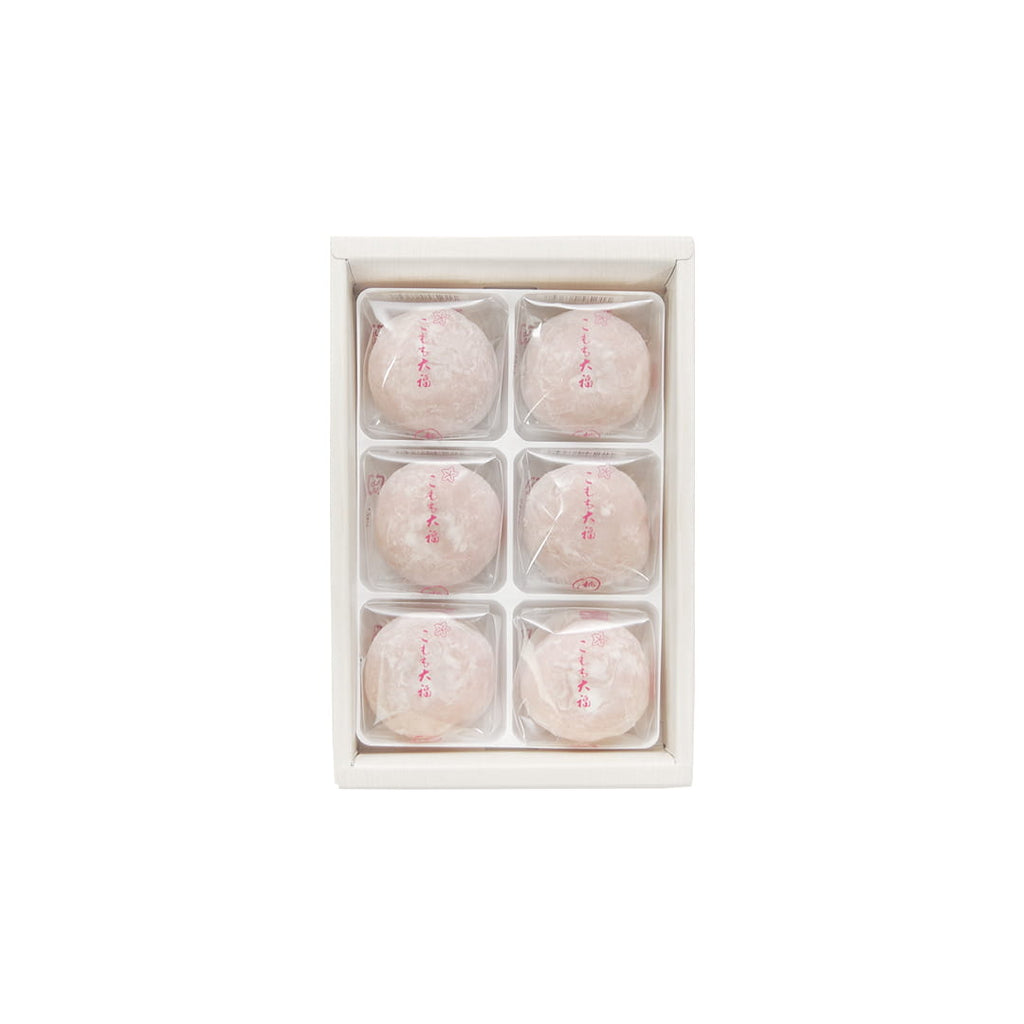 ほんのり桃色のやわらかいお餅となめらかな白餡で“こもも”を包みました。桃は種までやわらかく召しあがっていただけます。