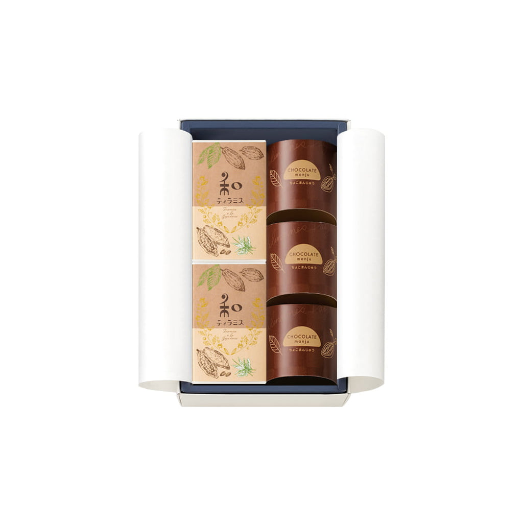 ココアの浮島でマスカルポーネ羊羹をサンドし、ココアパウダーで仕上げた特製の和風ケーキ「和ティラミス」2本、クーベルチュールチョコレートとココアを使ったしっとりとした焼き皮でミルク餡を包み、中にはやわらかいチョコクリームを詰めた「ちょこまんじゅう」3個を詰合せました。