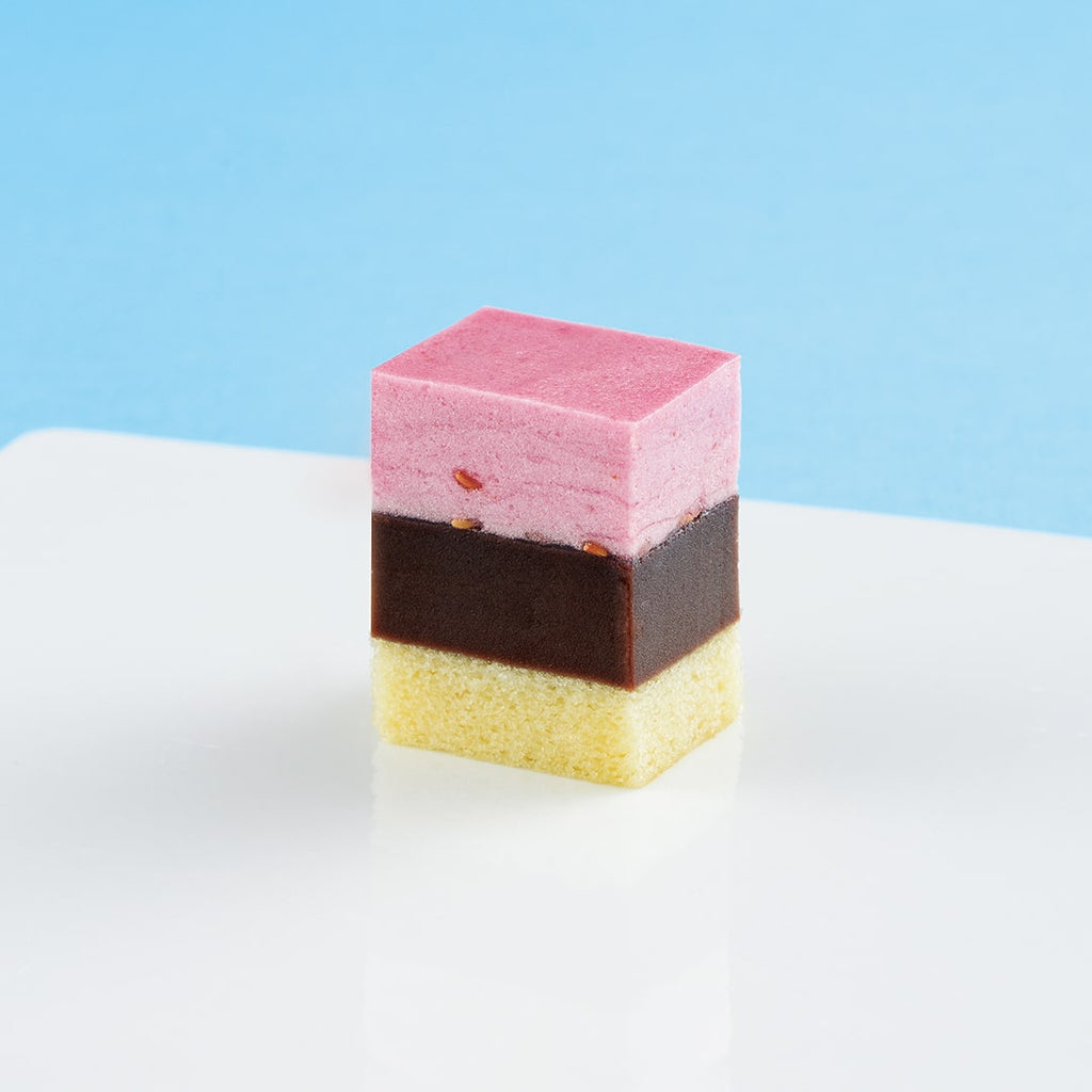 浮島・チョコレート羊羹・フランボワーズ淡雪を重ねた和風ケーキです。